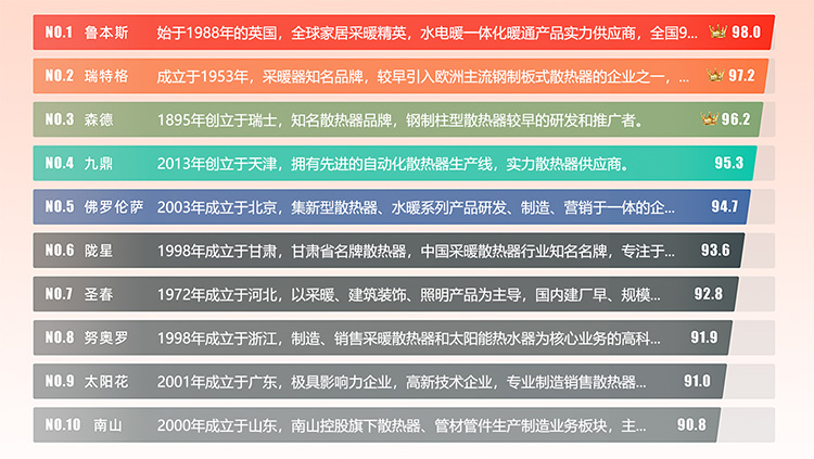 以上就是2023年最新暖氣片十大品牌排行榜,這些品牌以其優(yōu)質(zhì)的產(chǎn)品和良好的口碑贏得了消費(fèi)者的信賴。在